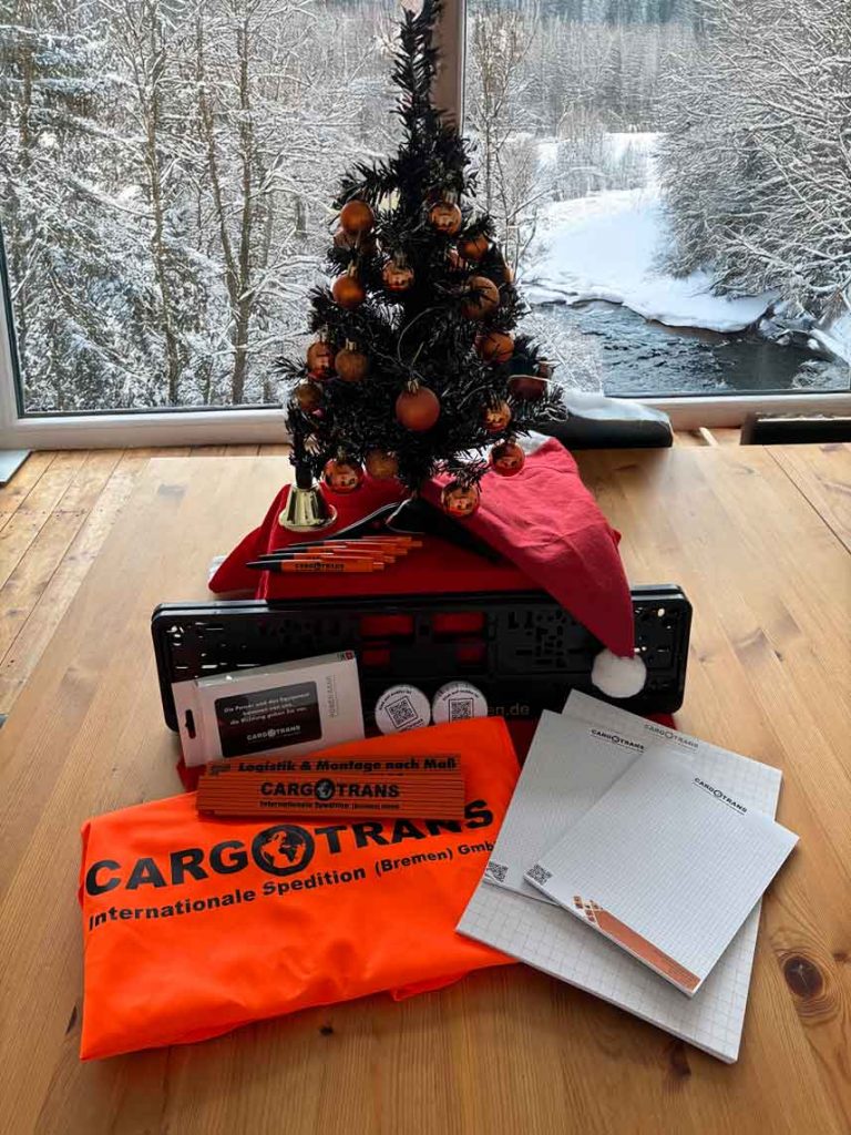 Hinter Türchen 13 wartet heute ein prall gefülltes CARGOTRANS-Werbemittelpaket auf dich – mit allem, was das Herz höherschlagen lässt. Von Zollstock bis Block, von Warnweste bis Powerbank.
